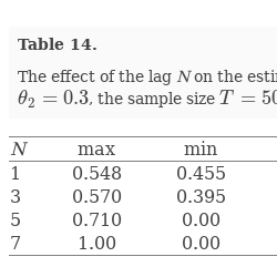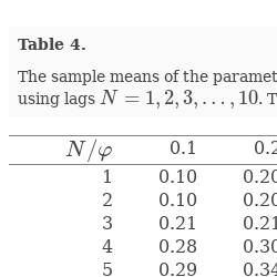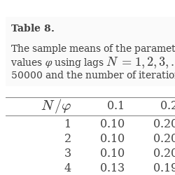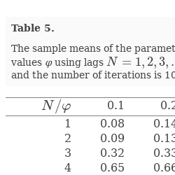 The effect of the lag N on the estimates $\hat{\varphi }=\hat{\phi }$ for an AR$(1)$ process. The sample size $T=5000$ and the true parameter value $\varphi =0.5$. The number of iterations is 1000