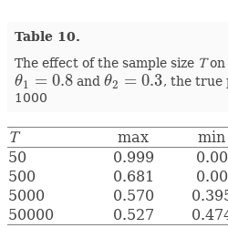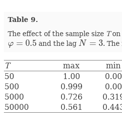 The effect of the true parameter value φ on the estimates $\hat{\varphi }=\hat{\phi }$ for ARMA$(1,2)$ processes. The MA parameters $\theta _{1}=0.8$ and $\theta _{2}=0.3$, the sample size $T=5000$ and the lag $N=3$. The number of iterations is 1000