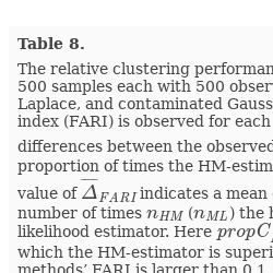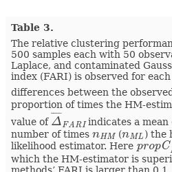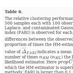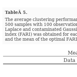 Clustering results in terms of fuzzy adjusted Rand index (FARI) for data containing no information about the class labels, i.e. the mixture components coincide. For each distribution (normal, logistic, Laplace, and contaminated normal), 5 values of the mixing proportion were considered. 500 samples each with 500 observations were generated