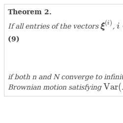 If all entries of the vectors ${\boldsymbol{\xi }}^{(i)}$, $i\in \{1,\dots ,p\}$, and $\boldsymbol{\varepsilon }$ have finite third moments, then if both n and N converge to infinity (at any rate), where $\boldsymbol{B}=(\boldsymbol{B}_{t})_{t\in \mathbb{R}_{+}}$ is a p-dimensional zero mean Brownian motion satisfying $\operatorname{Var}(\boldsymbol{B}_{1})=\boldsymbol{V}$.