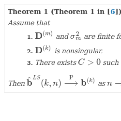 The following theorem provides conditions for the asymptotic normality and describes the dispersion matrix of the estimator ${\hat{\mathbf{b}}}^{\mathit{LS}}(k,n)$. Theorem 2 (Theorem 2 in [6]).
