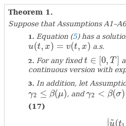 - 3. In addition, let Assumption A7 hold. Then for any fixed $\delta >0$ and $\gamma _{1}$, $\gamma _{2}$ such that $\gamma _{1}<\beta (\sigma )-1/2$, $\gamma _{2}\le \beta (\mu )$, and $\gamma _{2}<\beta (\sigma )-1/2$, the stochastic function $u(t,x)$ has a version $\tilde{u}(t,x)$ such that