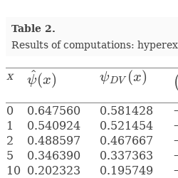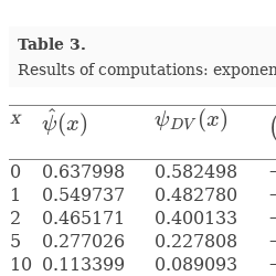 | x | $\hat{\psi }(x)$ | $\psi _{DV}(x)$ | $\big(\frac{\psi _{DV}(x)}{\hat{\psi }(x)}-1\big)\cdot 100\% $ | ${e}^{-\hat{R}x}$ | $\big(\frac{{e}^{-\hat{R}x}}{\hat{\psi }(x)}-1\big)\cdot 100\% $ |
