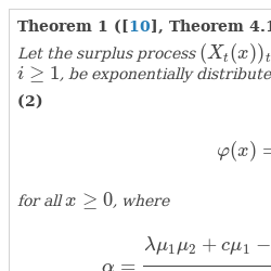 \[\varphi (x)=1+\frac{\lambda \mu _{1}(1-\alpha \mu _{2})}{(c\alpha -\lambda )(1-\alpha \mu _{2})(\mu _{1}+\mu _{2})+\lambda \mu _{2}}\hspace{0.1667em}{e}^{\alpha x}\]Remark 1 ([10], Remark 4.1).