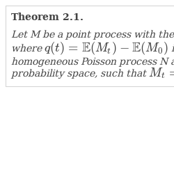 Consider a unit-rate homogeneous Poisson process $N={({N_{t}})}_{t\ge 0}$. A point process ${({\widetilde{M}_{t}})}_{t\ge 0}$ is an mPp if and only if ${\widetilde{M}_{t}}={N_{Wt}}$ in distribution, where W is an almost surely non-negative random variable independent of N. Common choices for the mixing random variable W are the Gamma distribution, leading to the Pólya process, or the uniform distribution on $[0,c)$, $c\in {\mathbb{R}_{+}}$.