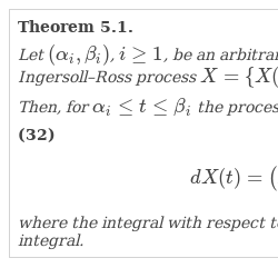 The Cox–Ingersoll–Ross (CIR) process, that was first introduced and studied by Cox, Ingersoll and Ross in papers [4–6], can be defined as the process $X=\{{X_{t}},t\ge 0\}$ that satisfies the stochastic differential equation of the form where $W=\{{W_{t}},t\ge 0\}$ is the Wiener process.