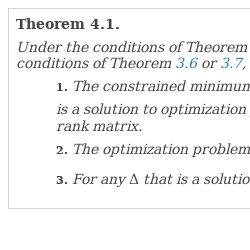 If the minimum in (11) & (8) is attained (say at some point $(\Delta ,{\widehat{X}_{\mathrm{ext}}})$), then the constraints in the right-hand side of (85) are compatible for $X={\widehat{X}_{\mathrm{ext}}}$ (particularly, Δ is a matrix that satisfies the constraints). Then by Proposition 7.3 the matrix ${\widehat{X}_{\mathrm{ext}}^{\top }}\varSigma {\widehat{X}_{\mathrm{ext}}^{}}$ is nonsingular. Thus, for $X={\widehat{X}_{\mathrm{ext}}}$, minimum in the right-hand of (85) is attained at ${\Delta _{1}}=\Delta $ (because Δ satisfies stronger constraints of (85) and brings a minimum to the same functional with weaker constraints of (11)).