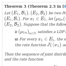 - ii) For every ${x_{1}}\in {E_{1}}$, the sequence ${({\mu _{2n}}(\cdot |{x_{1}}))}_{n\in \mathbb{N}}$ satisfies the LDP continuity condition on ${E_{2}}$ with the rate function $J(\cdot |{x_{1}})$ and the speed $\gamma (n)$.