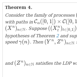 For ${y^{n}}\in {\mathcal{C}_{\alpha }}([0,1])$ let ${Z^{n,{y^{n}}}}$ denote the solution of equation (13) with y replaced by ${y^{n}}$. Then if ${y^{n}}\to y$ in ${\mathcal{C}_{\alpha }}([0,1])$, from the generalized Wentzell–Friedlin theory (Theorem 1 in [9]), we have that ${({({Z_{t}^{n,{y^{n}}}})_{t\in [0,1]}})}_{n\in \mathbb{N}}$ satisfies the same LDP in $\mathcal{C}([0,1])$ as ${({({Z_{t}^{n,y}})_{t\in [0,1]}})}_{n\in \mathbb{N}}$.