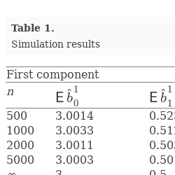 n $\operatorname{\mathsf{E}}{\hat{b}_{0}^{1}}$ $\operatorname{\mathsf{E}}{\hat{b}_{1}^{1}}$ $N\operatorname{Var}{\hat{b}_{0}^{1}}$ $N\operatorname{Var}{\hat{b}_{1}^{1}}$ $N\operatorname{Cov}({\hat{b}_{0}^{1}},{\hat{b}_{1}^{1}})$