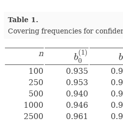 The covering frequencies for confidence sets are presented in Table 1. It seems that they approach the nominal covering probability 0.95 with satisfactory accuracy for sample sizes $n\ge 1000$.