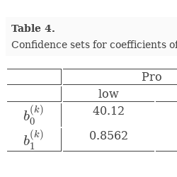 In this model we calculated the confidence intervals of the level $\alpha =0.05/3\approx 0.0167$ to derive the unilateral level $\alpha =0.05$ in comparisons of three intervals derived for three different components. The results are presented in Table 4. We observe that the obtained intervals are rather narrow. They don’t intersect for different components. So, the regression coefficients for different components are significantly different. (Of course, it is so only if our theoretical model of the data distribution is adequate.)