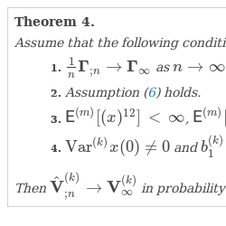 So, ${\mathbf{V}_{\infty }}$ defined by (10) is the ACM of the estimator ${\hat{\vartheta }^{(k)}}$ (the covariance matrix of the limit normal distribution of the normalized difference between the estimator and the estimated parameter). If it was known one could use it to construct tests for hypotheses on ${\vartheta ^{(k)}}$ or to derive confidence set for ${\vartheta ^{(k)}}$. In fact, for most estimators the ACM is unknown. Usually some estimate of ${\mathbf{V}_{\infty }}$ is used to replace its true value in statistical algorithms.