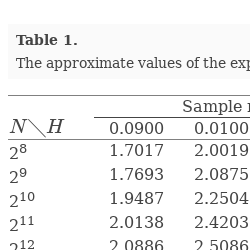 Combining Tables 1, 2, and 4, we get that all obtained sample means for $\mathbf{E}\max _{i=\overline{1,N}}{B}^{H}(i/N)$ satisfy the constraint