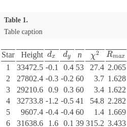 | Star | Height | ${d_{x}}$ | ${d_{y}}$ | n | ${\chi ^{2}}$ | ${R_{max}}$ | ${R_{min}}$ | P |