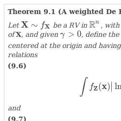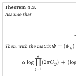 \[\begin{array}{r@{\hskip0pt}l}\displaystyle {h_{\varphi }^{\mathrm{w}}}\big({f_{C}^{\mathrm{No}}}\big)& \displaystyle =\frac{\alpha _{\varphi }(C)}{2}\log \big[{(2\pi )}^{d}\mathrm{det}(C)\big]+\frac{\log e}{2}\mathrm{tr}\big[{C}^{-1}\varPhi _{C,\varphi }\big]\hspace{1em}\text{where}\\{} \displaystyle \alpha _{\varphi }(C)& \displaystyle =\int _{{\mathbb{R}}^{d}}\varphi (\mathbf{x}){f_{C}^{\mathrm{No}}}(\mathbf{x})\mathrm{d}\mathbf{x},\hspace{1em}\varPhi _{C,\varphi }=\int _{{\mathbb{R}}^{d}}\mathbf{x}{\mathbf{x}}^{\mathrm{T}}\varphi (\mathbf{x}){f_{C}^{\mathrm{No}}}(\mathbf{x})\mathrm{d}\mathbf{x}.\end{array}\]
