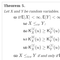 - • X is less than Y in convex order ($X\le _{cx}Y$) if $\mathsf{E}|X|<\infty $, $\mathsf{E}|Y|<\infty $, and $\mathsf{E}[\varphi (X)]\le \mathsf{E}[\varphi (Y)]$ for any convex function $\varphi \in C_{|x|}$;